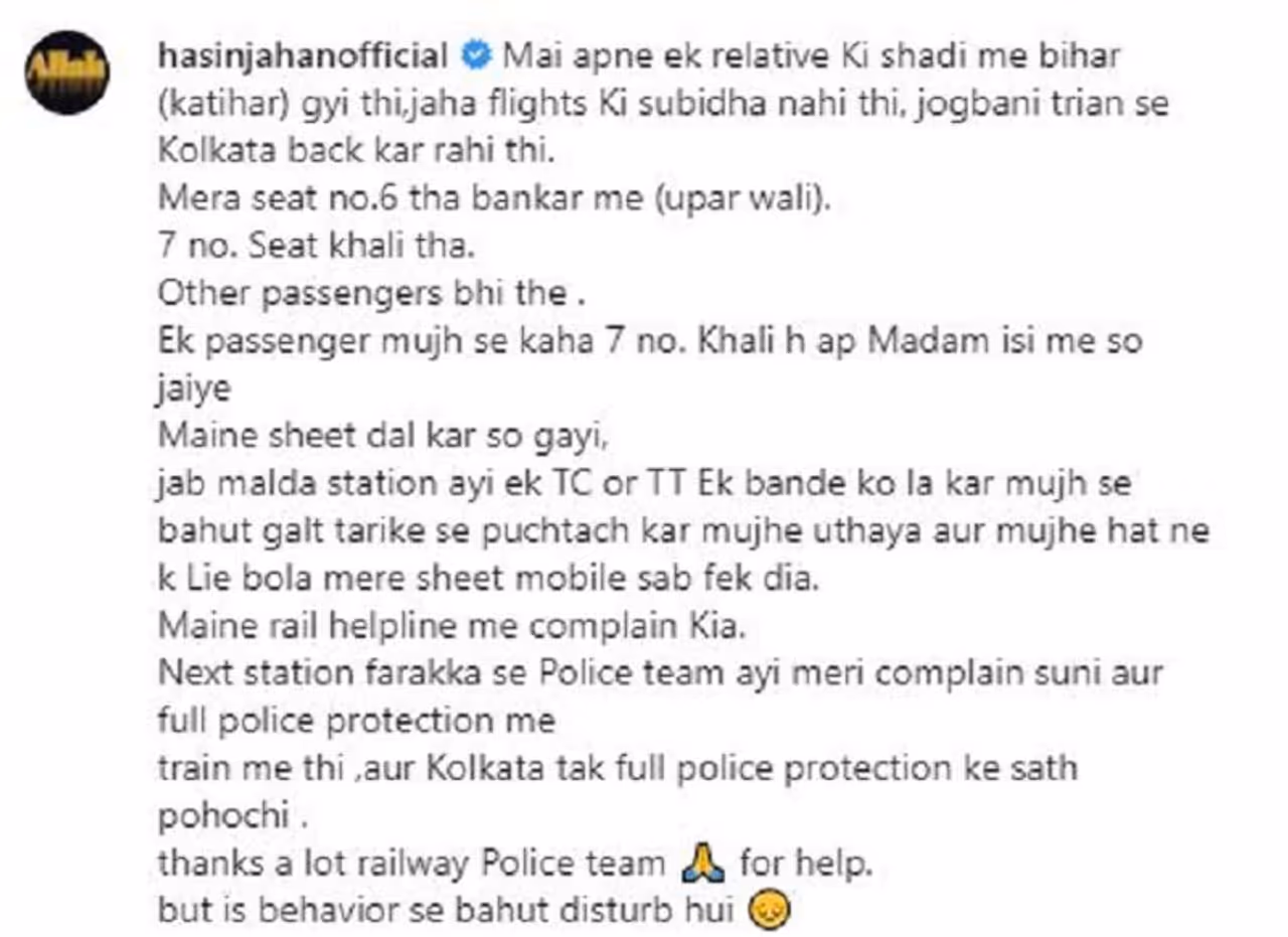 ಬಳಿಕ ಮತ್ತಷ್ಟು ಬರೆದುಕೊಂಡಿರುವ ಅವರು 'ಹಾಗಿದ್ದರೂ, ಮಾಲ್ಡಾ ಸ್ಟೇಷನ್ ಬಂದಾಗ, ಟಿಟಿಇ (TTE) ಇನ್ನೊಬ್ಬ ವ್ಯಕ್ತಿಯೊಂದಿಗೆ ನಾನಿದ್ದ ಸ್ಥಳಕ್ಕೆ ಬಂದಿದ್ದಲ್ಲದೆ, ನನ್ನನ್ನು ತಪ್ಪಾಗಿ ಪ್ರಶ್ನಿಸಿದರು. ನಾನಿದ್ದ ಸೀಟ್ಅನ್ನು ಖಾಲಿ ಮಾಡುವಂತೆ ಹೇಳಿ ಕೂಗಾಡಿದ ಅವರು, ನನ್ನ ಮೊಬೈಲ್ಅನ್ನೂ ಎಸೆದಿದ್ದಾರೆ. ಈ ವೇಳೆ ನಾನು ರೈಲ್ವೆ ಸಹಾಯವಾಣಿಗೆ ದೂರು ನೀಡಿದ್ದೇನೆ. ನಂತರ ಪೊಲೀಸ್ ತಂಡ ಫರಕ್ಕಾ ಠಾಣೆಗೆ ಬಂದು ದೂರು ಆಲಿಸಿ ಸಂಪೂರ್ಣ ರಕ್ಷಣೆಯೊಂದಿಗೆ ಕೋಲ್ಕತ್ತಾ ತಲುಪಿದ್ದೇನೆ. ರೈಲ್ವೇ ಪೊಲೀಸ್ ತಂಡಕ್ಕೆ ಧನ್ಯವಾದಗಳು, ಆದರೆ ಟಿಟಿಇ ವರ್ತನೆಯಿಂದ ನನಗೆ ತುಂಬಾ ನೋವಾಗಿದೆ ಎಂದು ಬರೆದುಕೊಂಡಿದ್ದಾರೆ.