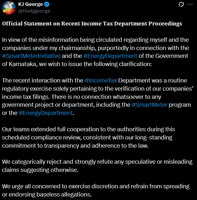 ಆಗಸ್ಟ್ 1 ರಂದು ಬಿಡುಗಡೆ ಮಾಡಿದ ಹೇಳಿಕೆಯಲ್ಲಿ, ಜಾರ್ಜ್ ಅವರು ಐಟಿ ಇಲಾಖೆಯ ಭೇಟಿಗೂ ಕರ್ನಾಟಕ ಸರ್ಕಾರದ ಸ್ಮಾರ್ಟ್ ಮೀಟರ್ ಕಾರ್ಯಕ್ರಮ ಅಥವಾ ಇಂಧನ ಇಲಾಖೆಗೂ "ಯಾವುದೇ ಸಂಬಂಧವಿಲ್ಲ" ಎಂದು ಹೇಳಿದ್ದಾರೆ.