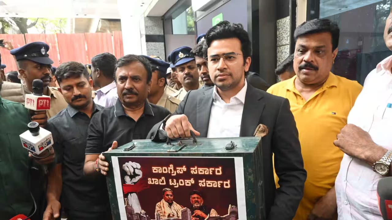 ಸಿಎಂ, ಡಿಸಿಎಂ ಭಾವಚಿತ್ರವಿದ್ದ ಮತ್ತು ಕಾಂಗ್ರೆಸ್ ಸರ್ಕಾರ ಖಾಲಿ ಟ್ರಂಕ್ ಸರ್ಕಾರ ಎಂದು ಮುದ್ರಣವಿದ್ದ ಸ್ಟಿಕರ್ ಅನ್ನು ಅಂಟಿಸಿ ವಿನೂತನವಾಗಿ ಪ್ರತಿಭಟನೆಗೆ ಯತ್ನಿಸಿದ್ದರು. ಆದರೆ ಪೊಲೀಸರು ಪ್ರತಿಭಟನೆಗೆ ಅವಕಾಶ ನೀಡಲಿಲ್ಲ. ಈ ವೇಳೆ ತೇಜಸ್ವಿ ಸೂರ್ಯ ಮತ್ತು ಪೊಲೀಸರ ಮಧ್ಯೆ ವಾಗ್ವಾದ ನಡೆಯಿತು. ತೇಜಸ್ವಿ ಅವರ ಕೈನಲ್ಲಿದ್ದ ಟ್ರಂಕ್ ಅನ್ನು ಕಸಿದುಕೊಂಡ ಪೊಲೀಸರು ಅವರನ್ನು ವಶಕ್ಕೆ ಪಡೆದು ಪೊಲೀಸ್ ಜೀಪಿನಲ್ಲಿ ಕೂರಿಸಿಕೊಂಡು ಕರೆದೊಯ್ದರು.