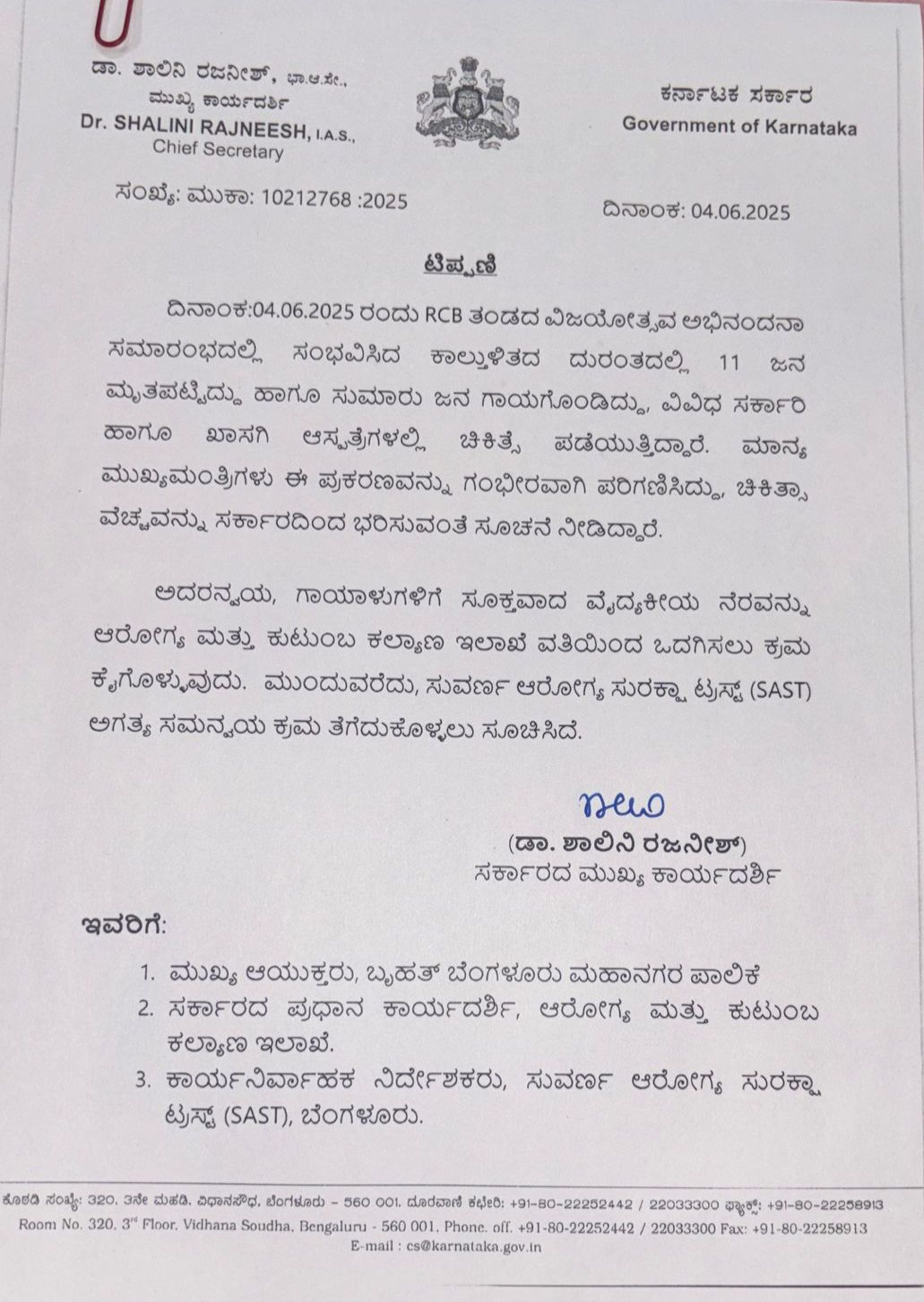 ಇದೀಗ ಆರ್ಸಿಬಿ ತಂಡದಿಂದ ಅಧಿಕೃತ ಘೋಷಣೆಯೊಂದನ್ನು ಮಾಡಿದೆ. ಇದರಲ್ಲಿ 'ನಿನ್ನೆ ಬೆಂಗಳೂರಿನಲ್ಲಿ ನಡೆದ ದುರದೃಷ್ಟಕರ ಘಟನೆಯು ಆರ್ಸಿಬಿ ಕುಟುಂಬಕ್ಕೆ ತೀವ್ರ ನೋವು ಮತ್ತು ನೋವನ್ನುಂಟು ಮಾಡಿದೆ. ಗೌರವ ಮತ್ತು ಒಗ್ಗಟ್ಟಿನ ಸಂಕೇತವಾಗಿ, ಆರ್ಸಿಬಿ ಮೃತರ ಹನ್ನೊಂದು ಕುಟುಂಬಗಳಿಗೆ ತಲಾ 10 ಲಕ್ಷ ರೂಪಾಯಿಗಳ ಆರ್ಥಿಕ ಸಹಾಯವನ್ನು ಘೋಷಿಸಿದೆ. ಇದರ ಜೊತೆಗೆ, ಈ ದುರಂತ ಘಟನೆಯಲ್ಲಿ ಗಾಯಗೊಂಡ ಅಭಿಮಾನಿಗಳನ್ನು ಬೆಂಬಲಿಸಲು ಆರ್ಸಿಬಿ ಕೇರ್ಸ್ ಎಂಬ ನಿಧಿಯನ್ನು ಸಹ ರಚಿಸಲಾಗುತ್ತಿದೆ. ನಾವು ಮಾಡುವ ಪ್ರತಿಯೊಂದಕ್ಕೂ ನಮ್ಮ ಅಭಿಮಾನಿಗಳು ಯಾವಾಗಲೂ ಹೃದಯಭಾಗದಲ್ಲಿ ಇರುತ್ತಾರೆ. ನಾವು ದುಃಖದಲ್ಲಿ ಒಗ್ಗಟ್ಟಿನಿಂದ ಇರುತ್ತೇವೆ' ಎಂದು ಪೋಸ್ಟ್ ಮಾಡಿದೆ.